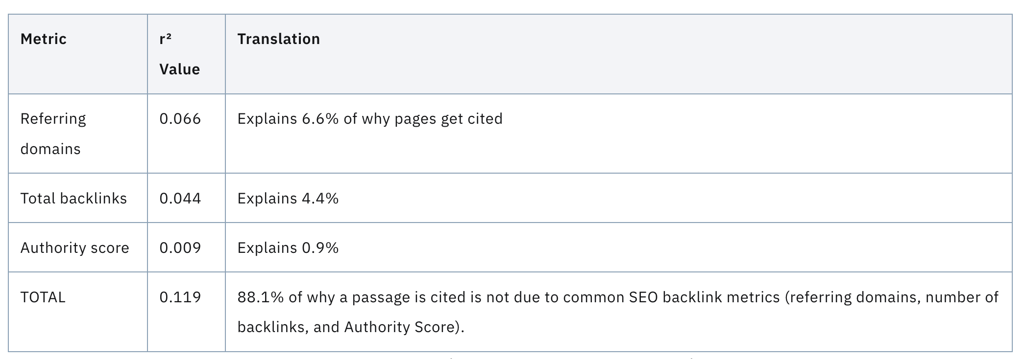 The “it’s different” crowd does have research to point to, and this example centers around backlinks. Backlinks have been a cornerstone of SEO since forever (my first SEO project was in 2006). It’s pretty common for practitioners to consider them a third of the entire discipline. The argument goes: once a website is indexed, backlinks barely move the needle for AI citations, which is saying that one of the largest pillars of traditional SEO is irrelevant.