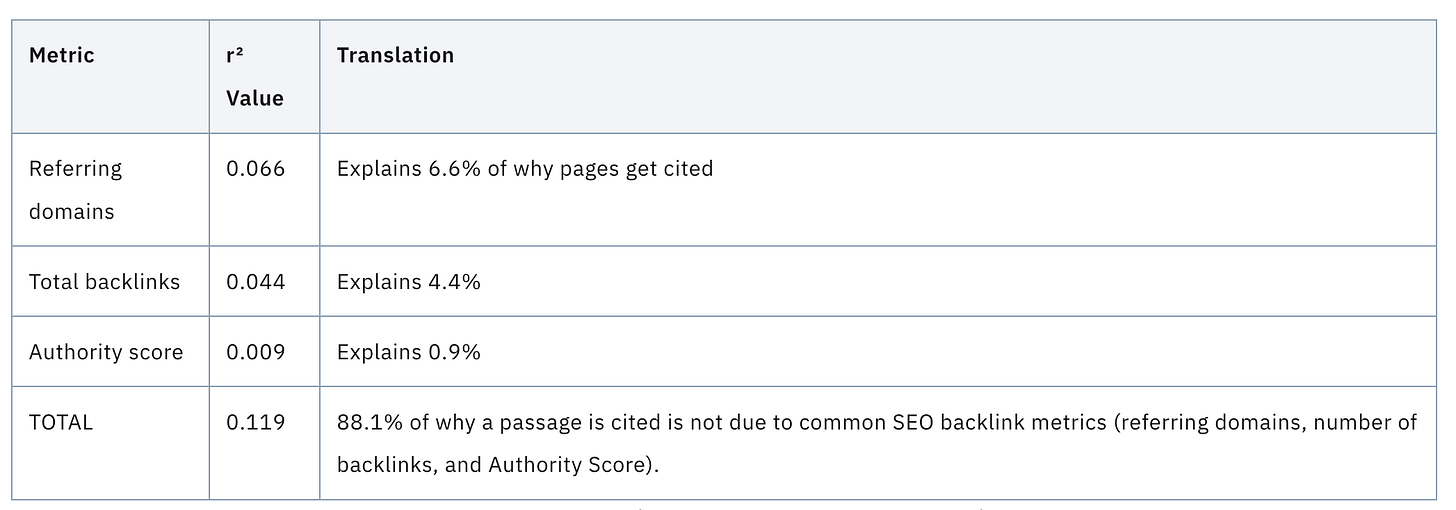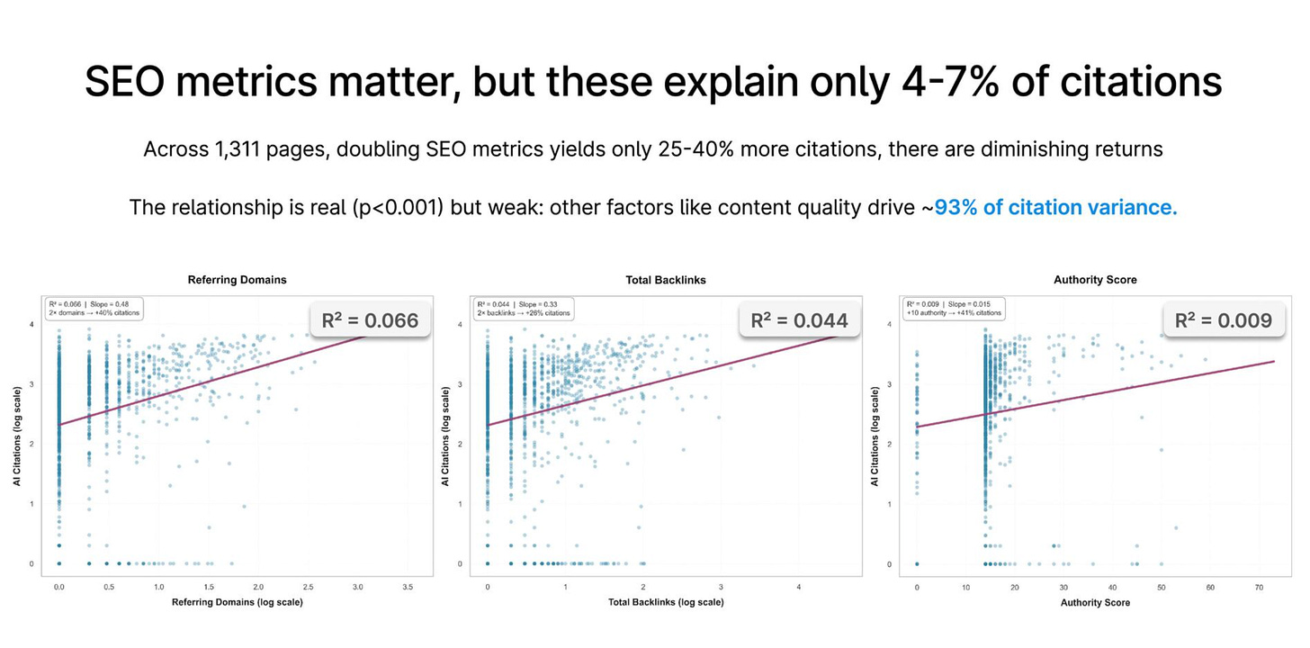 By the way: There are SEOs who have never reported a backlink metric in their lives and who get pages to rank through content depth and technical excellence (while allowing PR and brand authority substitute for SEO link building), and none of that showed up in this data. So when you hear “SEO only explains 4-7% of AI citations,” understand what that actually means: backlink metrics explain 4-7%, which is a very different claim than “SEO doesn’t matter.” I do think the study is valuable, but it measured one slice of SEO and LinkedIn crypto-turned-GEO bros ran with it, and to the industry’s detriment sold AEO/GEO to real companies, and now here we are.