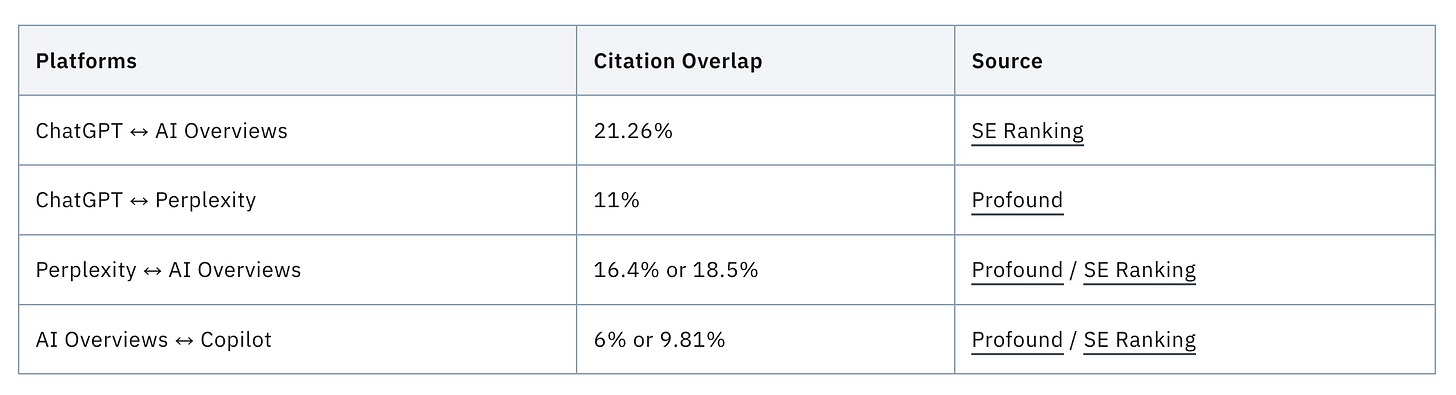 The citation overlap between platforms ranges from 6% to 21% and helps us understand an angle of this: